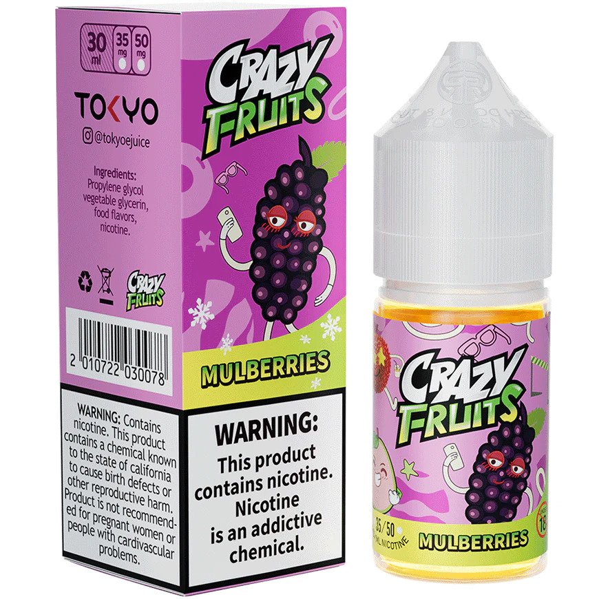 The Tokyo Crazy Fruits Mulberries is a special flavor. It tastes like fresh mulberries, which are sweet, dark, and slightly tart. Vape Craze brings this unique berry taste to Pakistan.